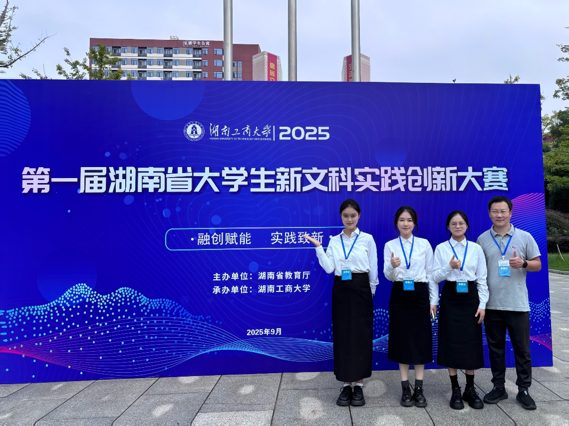 本网讯(通讯员 施玲丹)9 月 26 日至 27 日,湖南省第一届大学生新文科实践创新大赛决赛在湖南工商大学举行。我院 23 级商务英语施玲丹、胡雨欣、刘欣璐、陈海莉四人组成的团队,历经两天的激烈比拼,成功斩获省赛金奖。