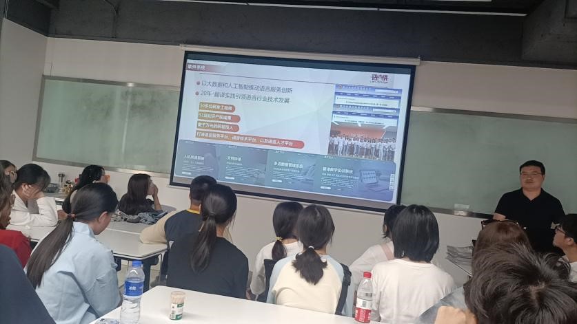 在参观完公司之后,四川语言桥信息技术有限公司的两位负责人与同学们一起座谈交流。首先是项目经理苏红利老师,他介绍了公司的基本概况,还介绍公司的软件系统以及现阶段AI在语言系统中的应用。第二位是人力资源经理蒙慧骢老师,她与同学们进行沟通交流,询问了同学们的职业规划,并对同学们的职业规划做出了指导。