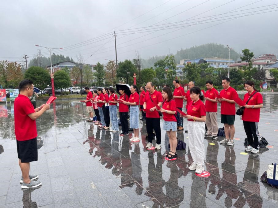 在这里,全体党员同志不顾细雨绵绵,在学院党委书记简功友书记的带领下重温了入党誓词。并在支部副书记奉红平同志的带领下,宣读了师德师风誓词。