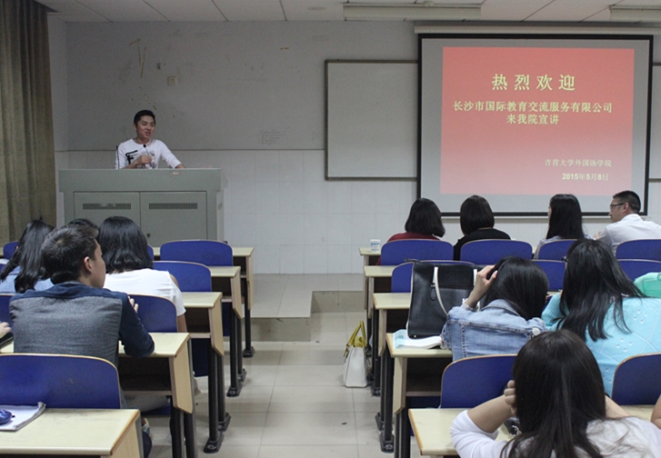 本网讯(杨东旭 余孟韬 何婷)5月8日长沙市国际教育交流服务有限公司于逸夫楼3220教室进行宣讲。此次宣讲由冯蕾老师主持。该公司优秀员工代表及公司负责人就当前日语专业就业形势以及个人经验与我院日语专业学生进行交流。