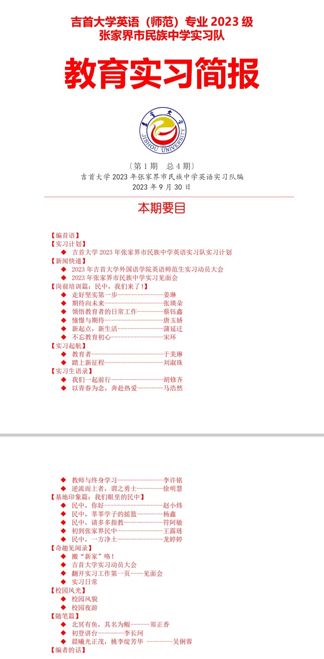 《简报》由实习队学生干部胡修齐、姜琳、李长珂、徐明慧、吴俐蓉负责,委托徐明慧同学具体落实,由实习队21名来自2020级英语(师范)专业实习生以小组为单位轮值组织。截至目前,在全体队员的积极配合下,第一期已经顺利出刊。
