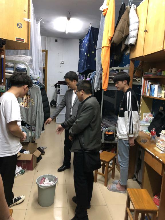 本网讯(通讯员 李干 奉洁 孙欣然)4月22日晚,外国语学院党委副书记尚道文和学生辅导员郑惠杰、向芳、唐剑走访了学院第8栋、第10栋男生寝室和第6栋女生寝室。